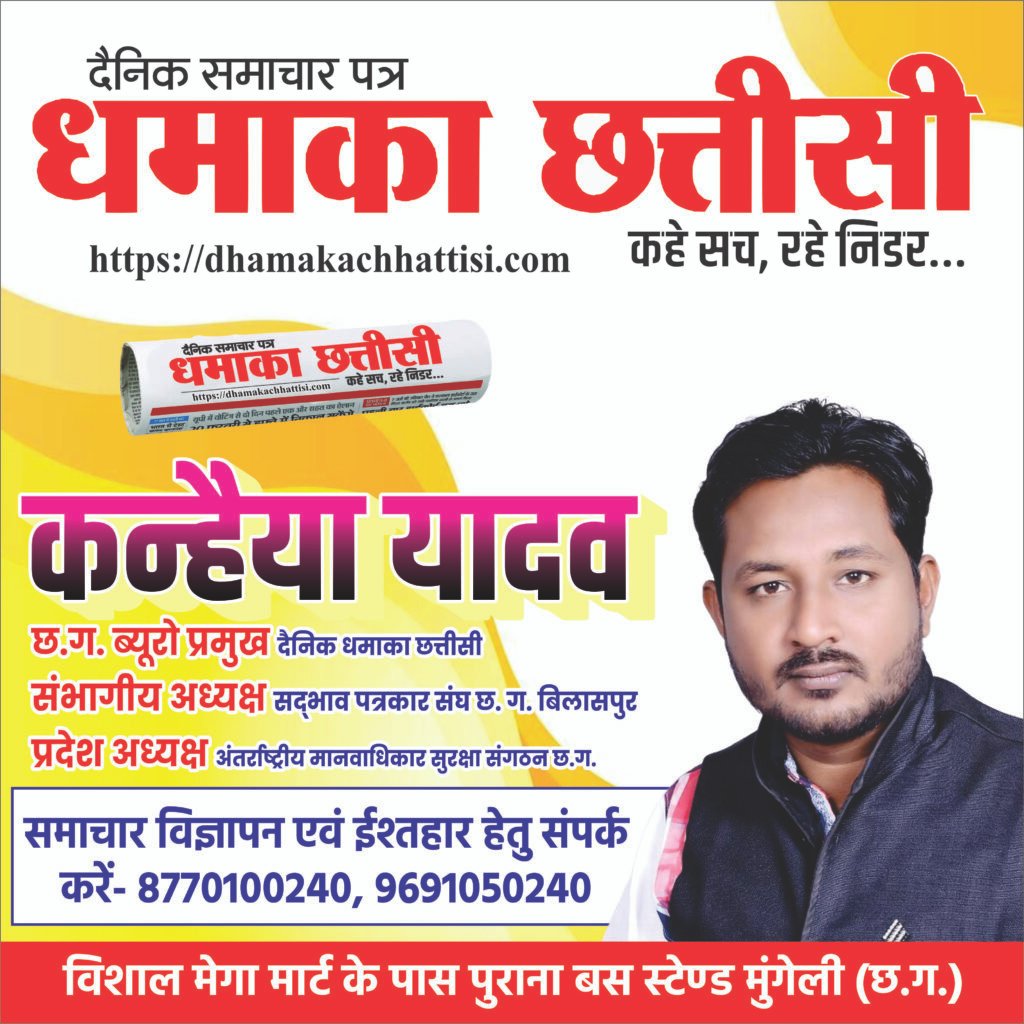 दैनिक धमाका छत्तीसी के डायरेक्टर महेश गोयन, संपादक शैलेश कुमार शर्मा, असिस्टेंट डायरेक्टर व छत्तीसगढ़ ब्यूरो…