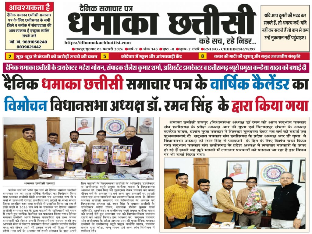 प्रत्येक वर्ष की भांति इस वर्ष भी दैनिक धमाका छत्तीसी समाचार पत्र का आज वार्षिक कैलेंडर का विमोचन किया गया धमाका छत्तीसी हिंदी समाचार पत्र अनवरत रूप से 9 वर्षों से राजधानी रायपुर प्रकाशित कर प्रदेशों के सभी संभाग जिला तहसील स्तर तथा ब्लॉको में प्रसारित किया जा रहा है इसी कड़ी में 2026 नव वर्ष के उपलक्ष्य पर दैनिक धमाका छत्तीसी समाचार पत्र के द्वारा पाठकों के सुविधाओं को ध्यान में रखते हुए वार्षिक कैलेंडर का प्रकाशन किया गया। दैनिक धमाका छत्तीसी अपने निष्पक्ष पत्रकारिता एवं तथ्य जनक समाचारों को लेकर अपनी विश्वसनीयता कायम करते हुए आपकी सेवा में निरंतर प्रयासरत है तथा आपके पठनीय विषय वस्तु को लेकर आगे भी प्रस्तुत करने की दिशा में प्रयास रहेगा। नव वर्ष के अवसर पर हमारे संस्थान के द्वारा अपने प्रिय पाठकों के लिए